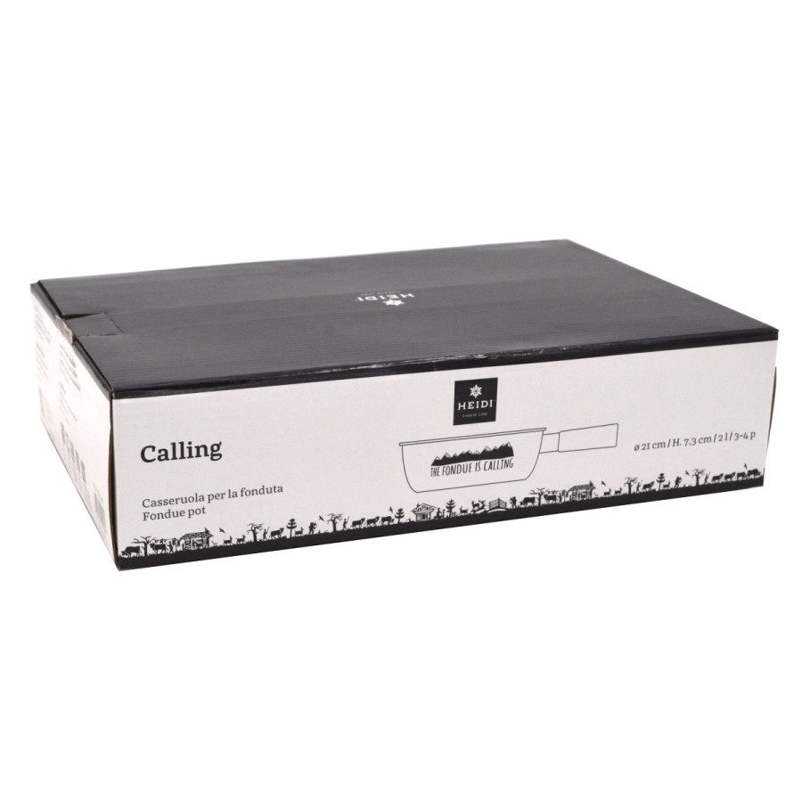 Caquelon à fondue en métal léger émaillé (770 g) blanc, intérieur blanc et manche rond en hévéa, décor noir, Ø 21 cm, H 75 mm, 1.7l, 3 à 4 personnes