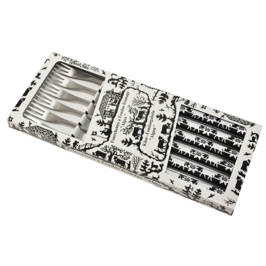 Set 6 fourchettes à fondue 3 dents, manche ABS noir avec décor Poya blanc