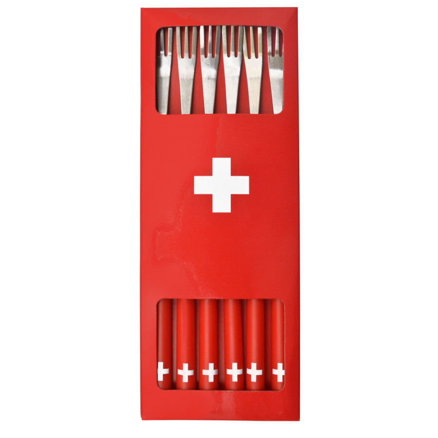Set 6 fourchettes à fondue 3 dents, manche ABS rouge et Croix Suisse